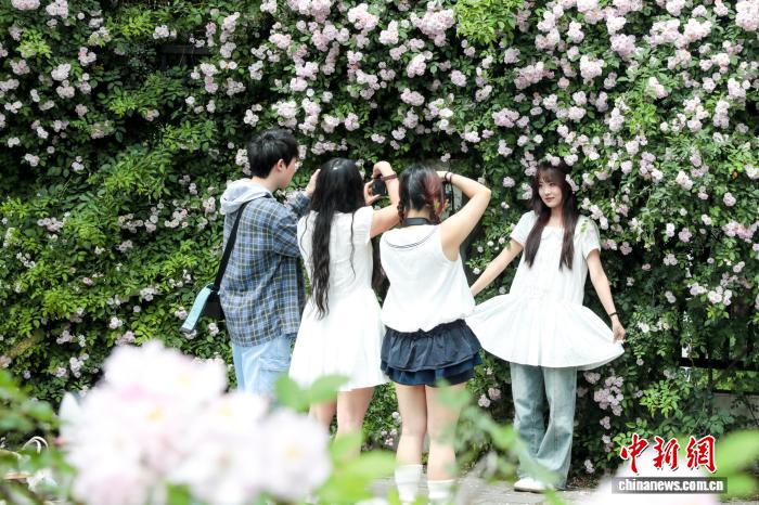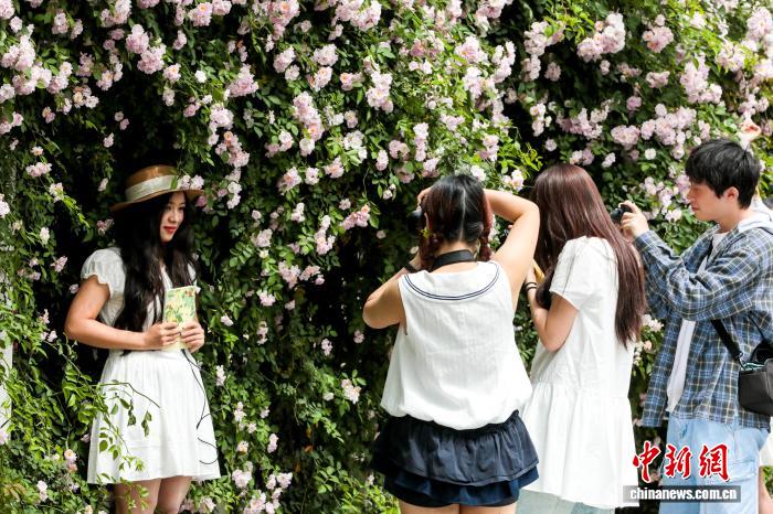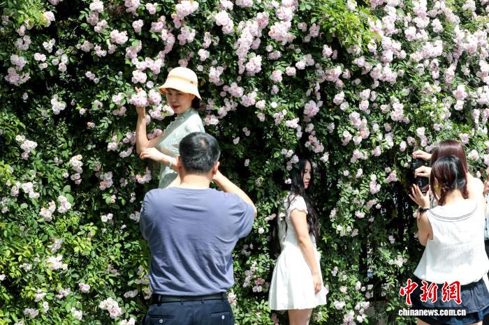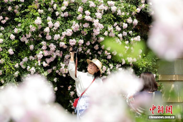 图为旅客正在蔷薇花墙前摄影。中新社记者 弛畅 摄