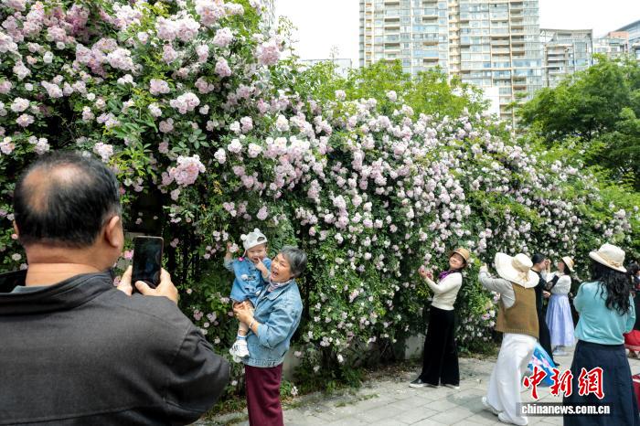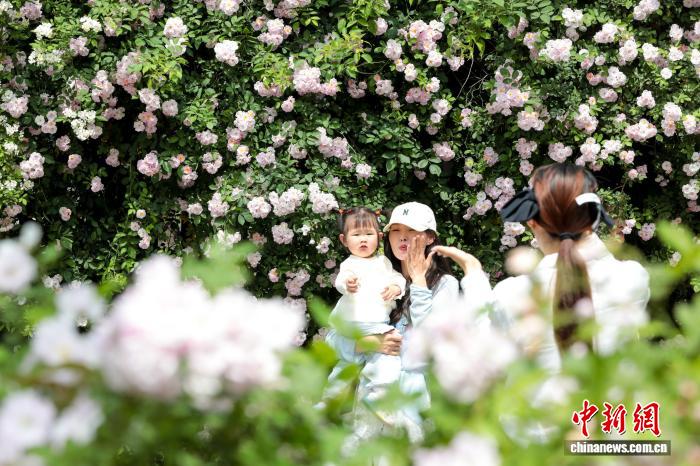 图为年夜人带着儿童正在蔷薇花墙前摄影。中新社记者 弛畅 摄